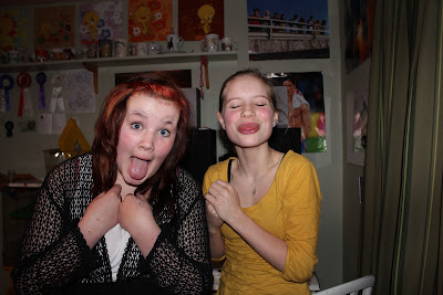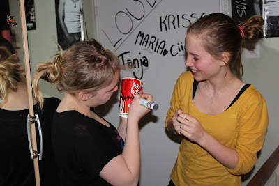 Oli kiva ilta, Maria, Krista, Ciia ja Tanja oli täällä. Meillä oli sellasseet kivat ala-aste limubileet, juotii limuu ja simaa ja syötiin paljon karkkia & sipsii ja katottii Titanic. Me jopa kirjotettiin nimet meijän mukeihin, enpä ole ollut pitkään aikaan tällässillä synttäreillä, siis pidettiin Kristan (7.4) ja Tanjan (6.4.) synttäreitä samalla. Ciia onnistu tahmaamaan olkkarissa, limupullo vähän kuohu.