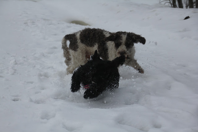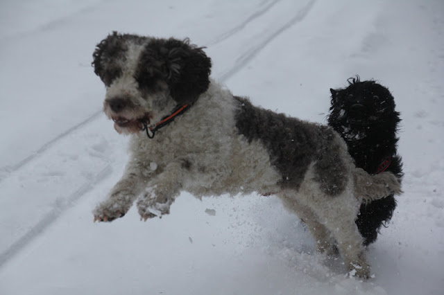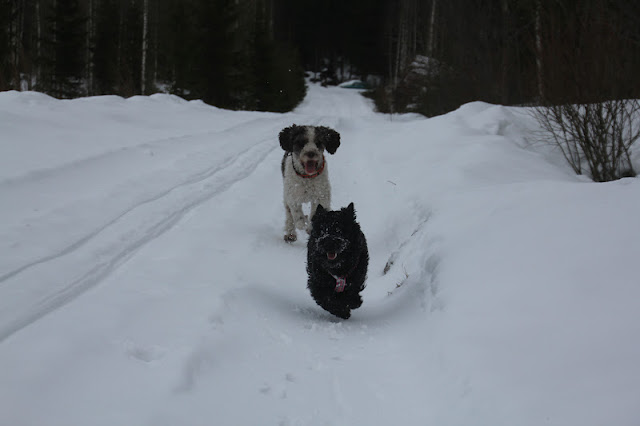 Tähän alkuun heti pahoittelen kuvien laaduttomuutta niin sisällöllisesti, kuin valokuvauksellisesti. Postailen mutsin koneella niin en pääse edes rajauksia ja valotusta muuttamaan. Kuitenkin, oltiin tänään lenkkeilemässä läheisen pellon takana kaverin ja sen koiran, Rokin kanssa. Roki on vissiin 7- tai 8-vuotias Espanjanvesikoira eli siis tuo isompi ja vaaleampi noissa kuvissa. Rudolfista ei löytynyt kuvia, joissa se ei näytä psykopaatilta tai muuten vaan idiootilta.