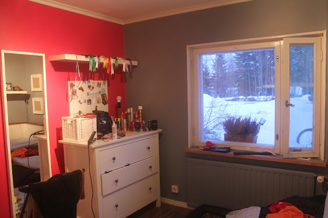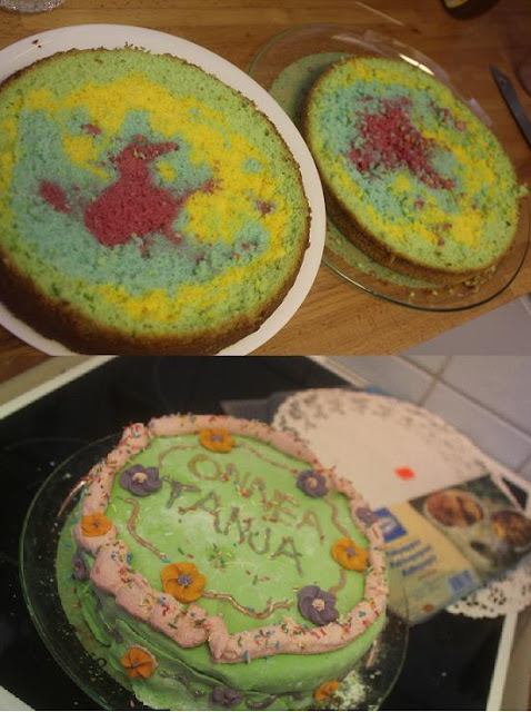 Heissan! Sain vihdoinkin otettua kuvia tosta mun huoneesta, lattia oli vähän sotkunen joten piti ottaa kuvat niin, ettei se kauheasti näy, toivottavasti ei haittaa : D. Pidettiin perjantaina kaverille yllätys kakkukekkerit ja katteltiin leffoja. Toi kakku oli niin koomisen värinen, yritin epätoivosesti tehä sellasta raidallista sateenkaarikakkuu mis ois raitoja, mut feilasin sen. Onneks tykkään leikkii elintarvikeväreil ja sokerimassalla.